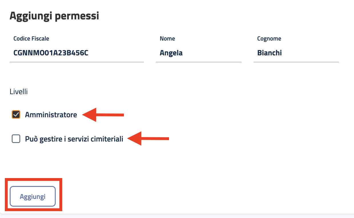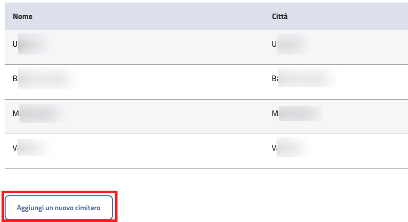 A partire dalla homepage è possibile aggiungere un nuovo cimitero usando il tasto Aggiungi nuovo cimitero