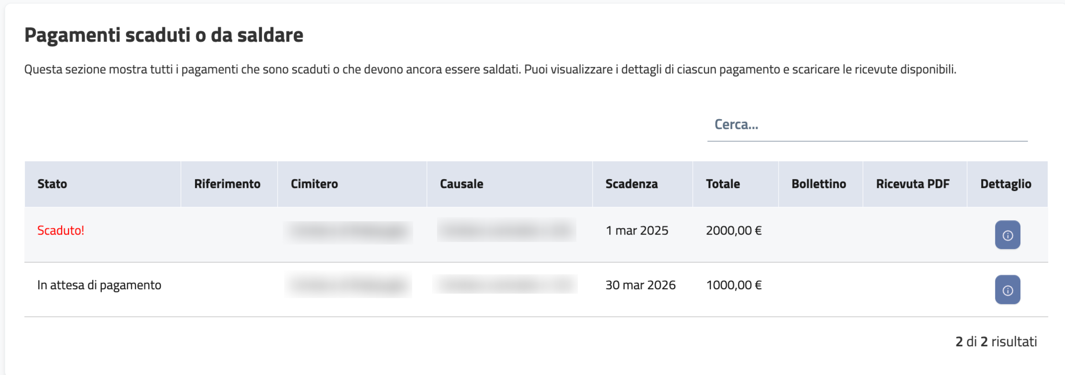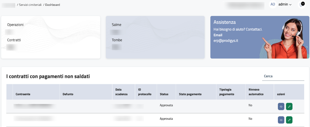 Grazie alla dashboard è possibile tenere traccia di tutti i contratti il cui pagamento non è ancora stato effettuato avendo evidenza diretta del contraente e dell’eventuale defunto di riferimento.